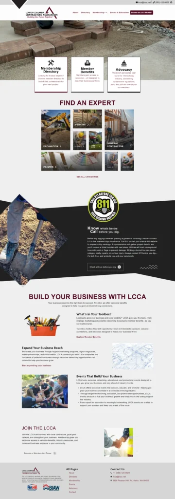 The redesigned site now provides streamlined access to essential functions—finding experts, becoming a member, and accessing 811 info. Feedback shows improved engagement with membership sign-ups and directory searches, reinforcing LCCA’s position as the go-to local contractor association.