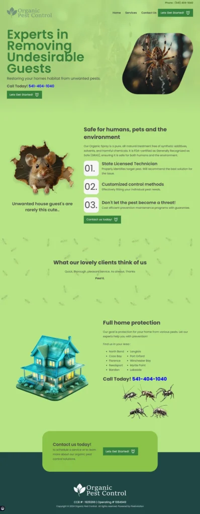 Pixelvolution developed organicpesttech.com to establish a strong online presence, enhance brand credibility, and generate leads for Organic Pest Technologies. The website highlights the company’s expertise in eco-friendly pest control, emphasizing safe, effective, and environmentally responsible solutions. Built using Bricks Builder on WordPress, the site is designed for speed, performance, and SEO optimization, utilizing WP-Rocket and Plesk hosting to ensure a seamless user experience. The goal is to create a highly responsive, intuitive, and conversion-driven platform that attracts homeowners and businesses seeking non-toxic pest control solutions.